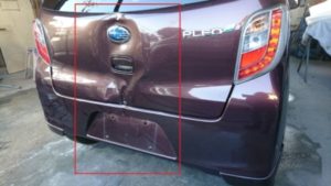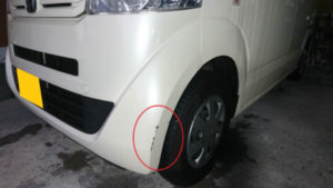 ▼樹脂製のバンパーはキズの部分を削り、パテを塗りました。