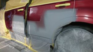 ▼パテ研磨が終わったら、周辺をマスキングして下地処理剤のサフェーサーを吹き付けます。